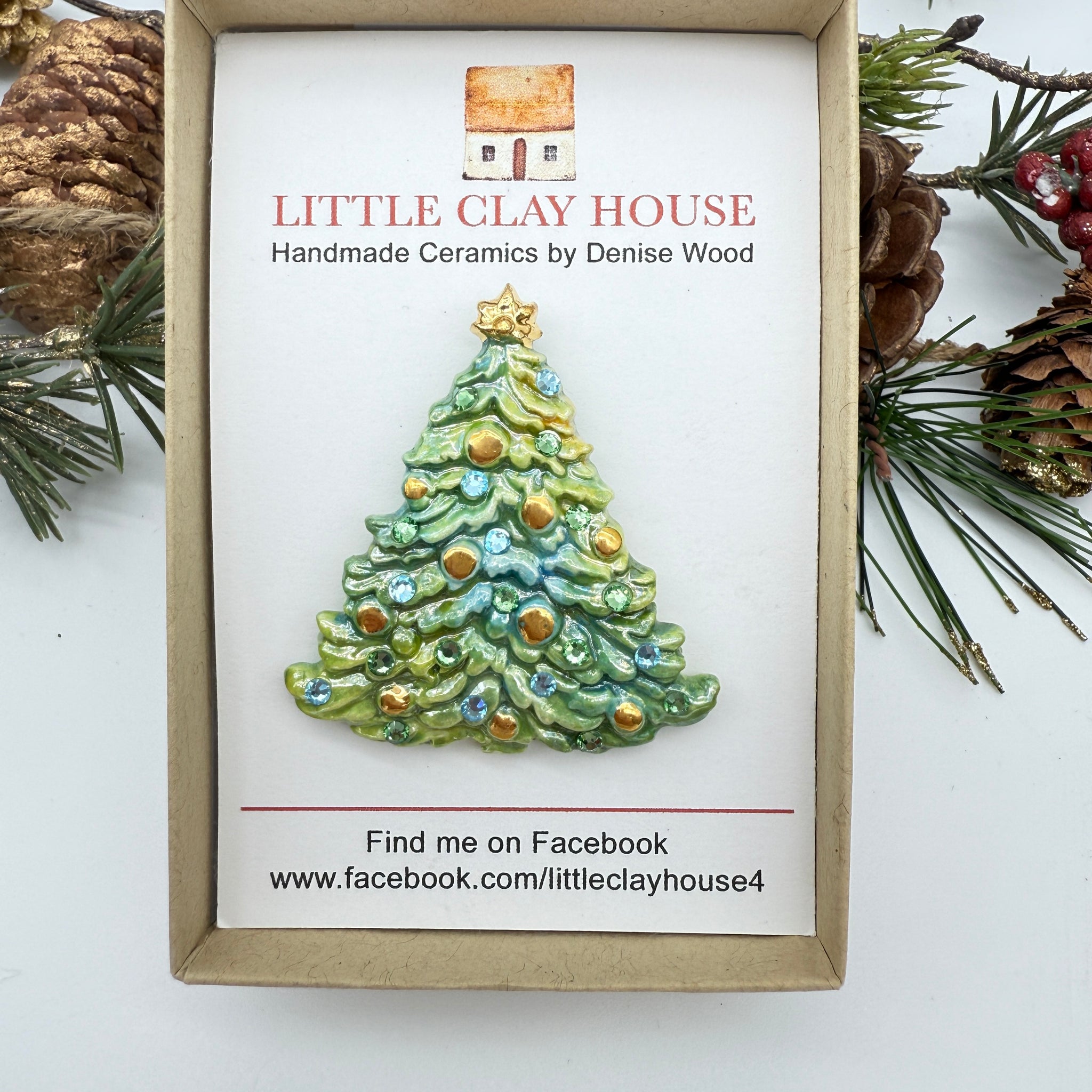 Christmas Tree Ceramic Brooch - Verigated Green/Blue