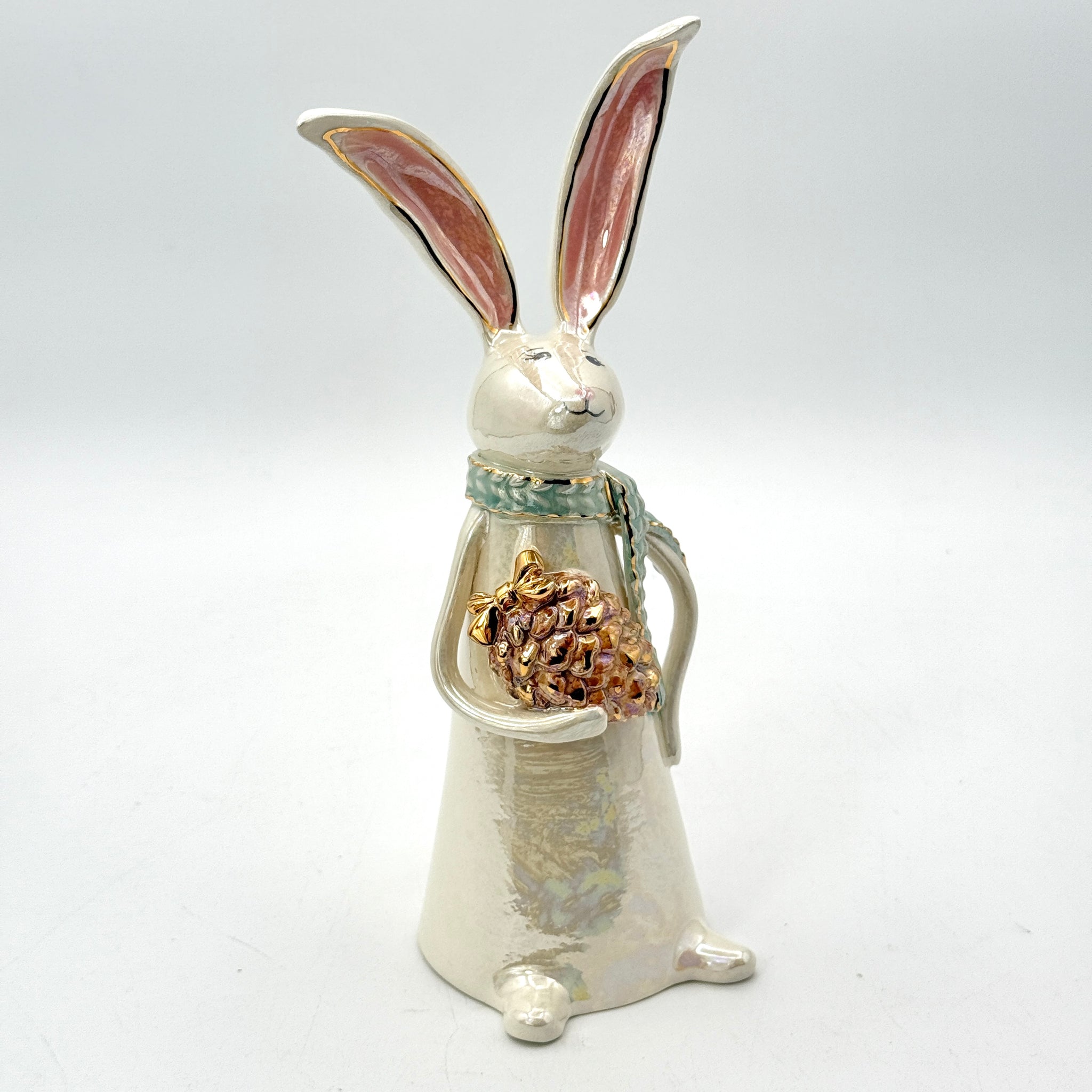 This sweet handmade ceramic bunny is truly one of a kind — hand-sculpted, detailed, and signed by me, one at a time, with care and love. Standing approximately 6.5 to 8 inches tall, each bunny features delicate mother-of-pearl luster and real gold luster accents on its ears and the special treasure it holds — whether that’s a tiny pumpkin, acorn, heart, or ribbon.