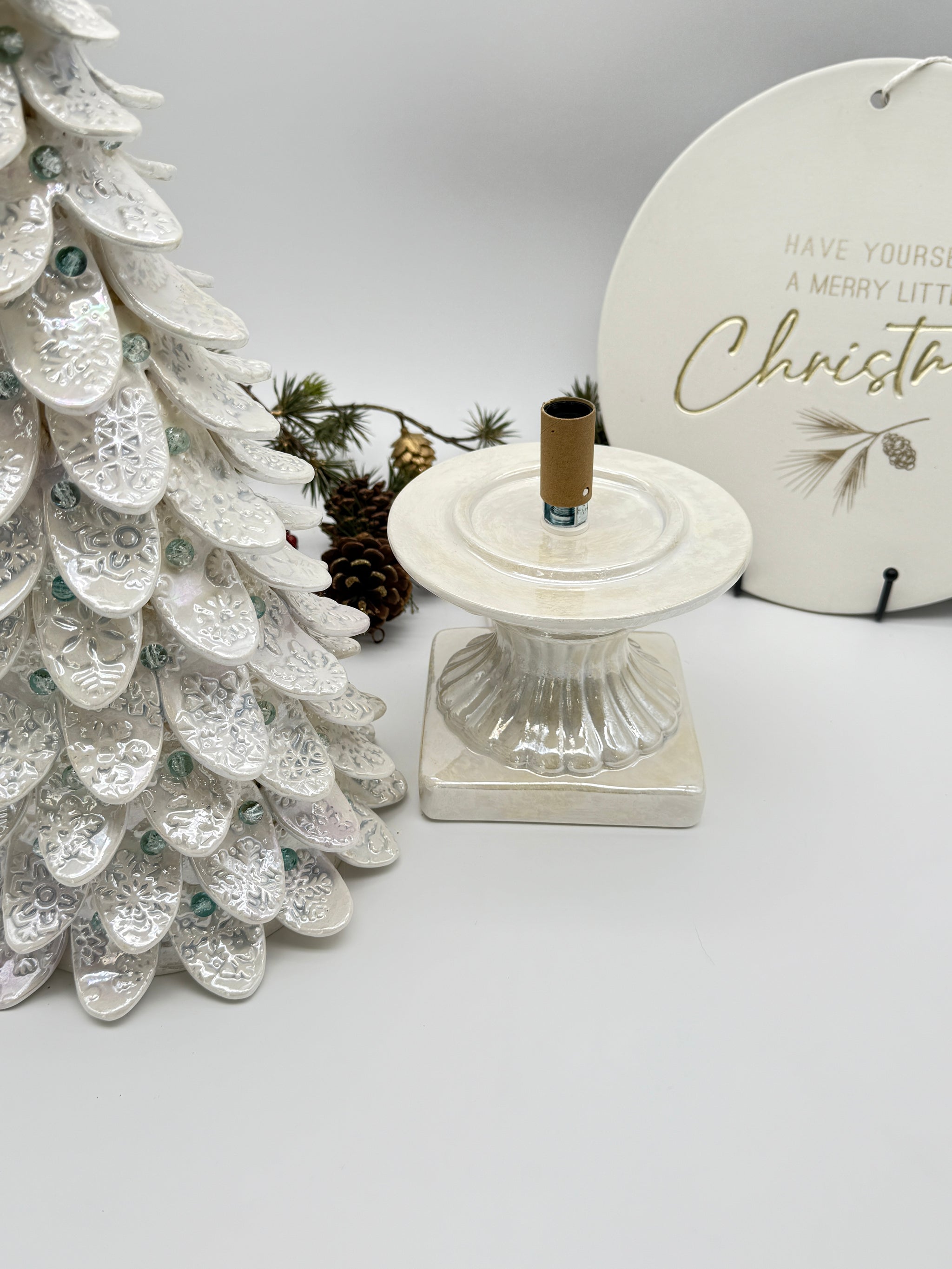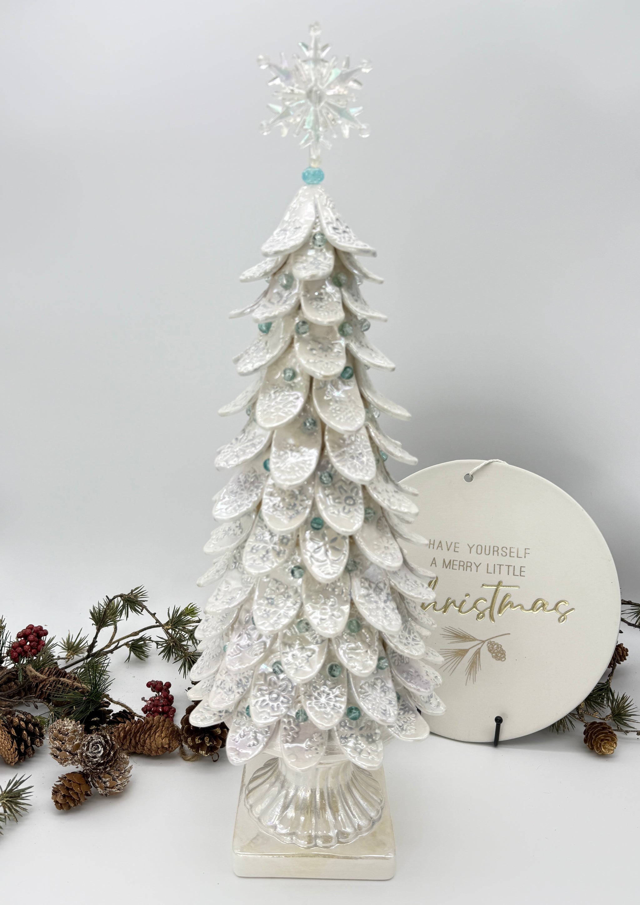 This hand-built Snowflake Tree is a one-of-a-kind, original, copyrighted sculpture that brings the magic of winter to life. Standing approximately 18½ inches tall (excluding the star topper), each branch is embossed with delicate snowflake designs, kissed with a pale icy blue for a frosted, wintry glow.