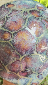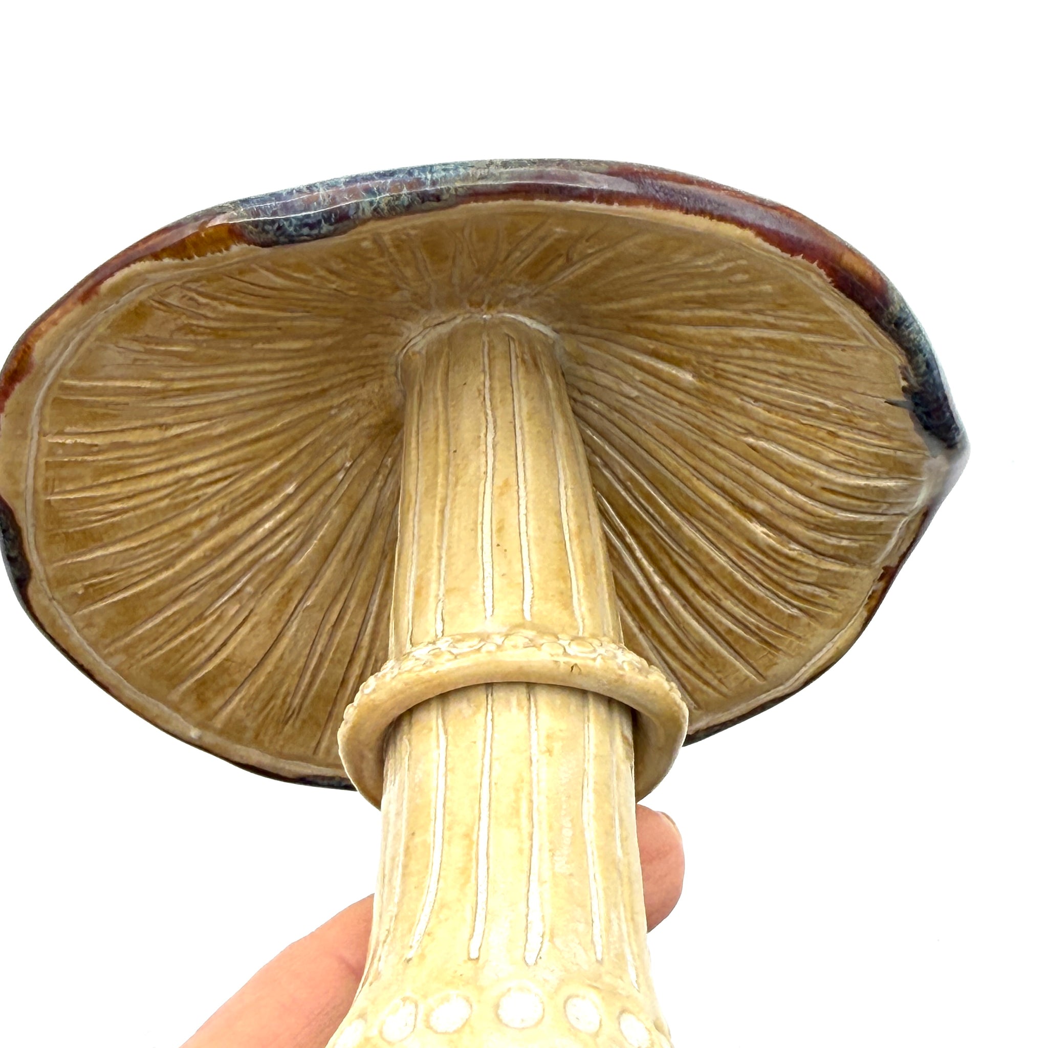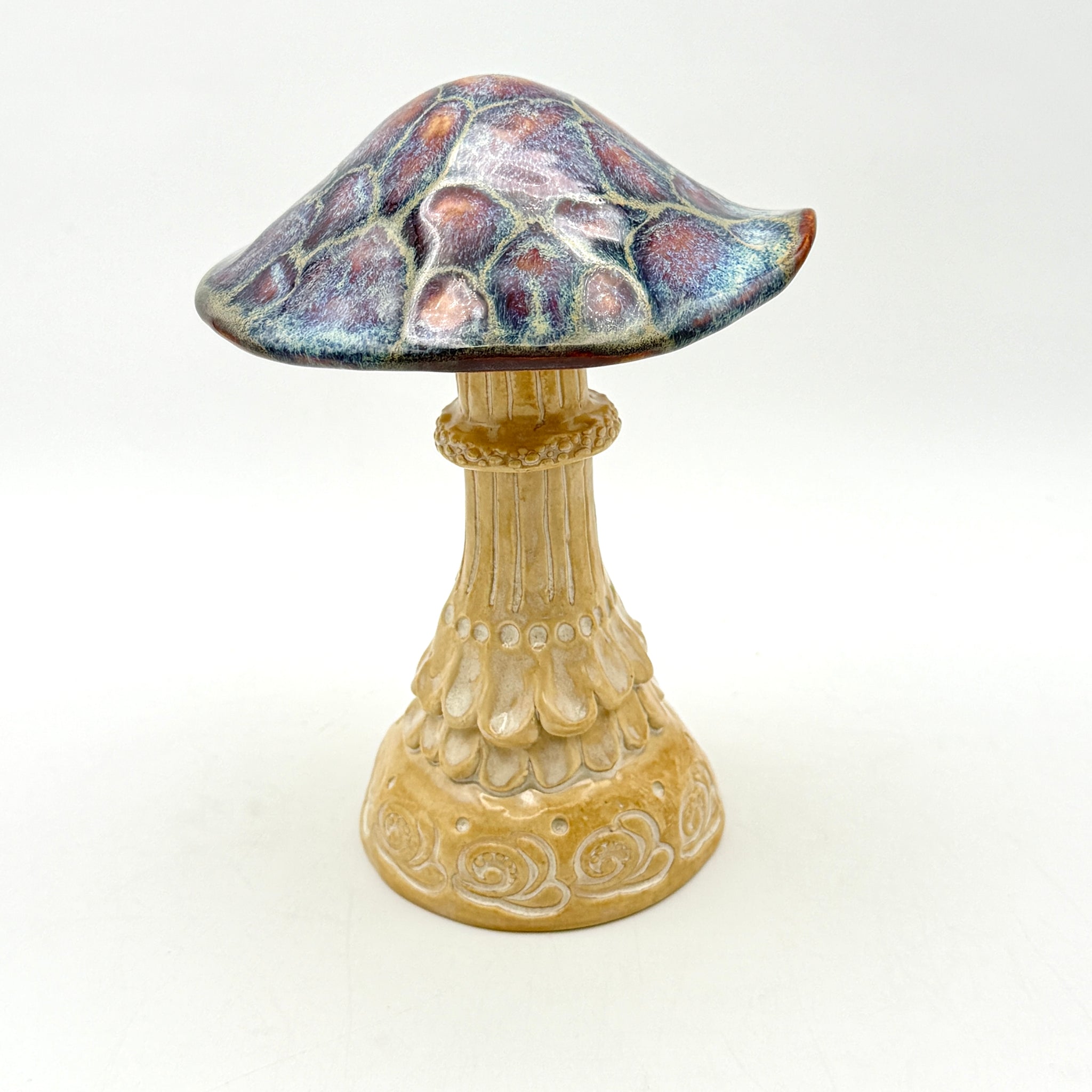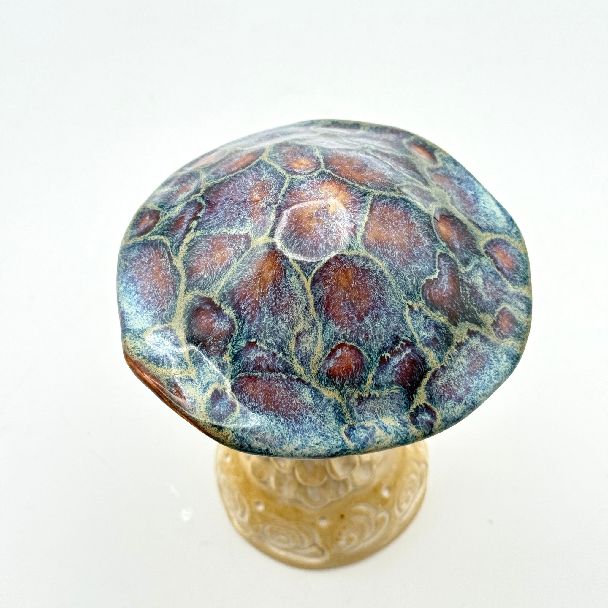 This one-of-a-kind mushroom was handbuilt from stoneware clay and finished in rich, layered glazes. The cap has deep purples, blues, and earthy tones that shift in the light—each one turns out a little different, and this one’s a standout.
