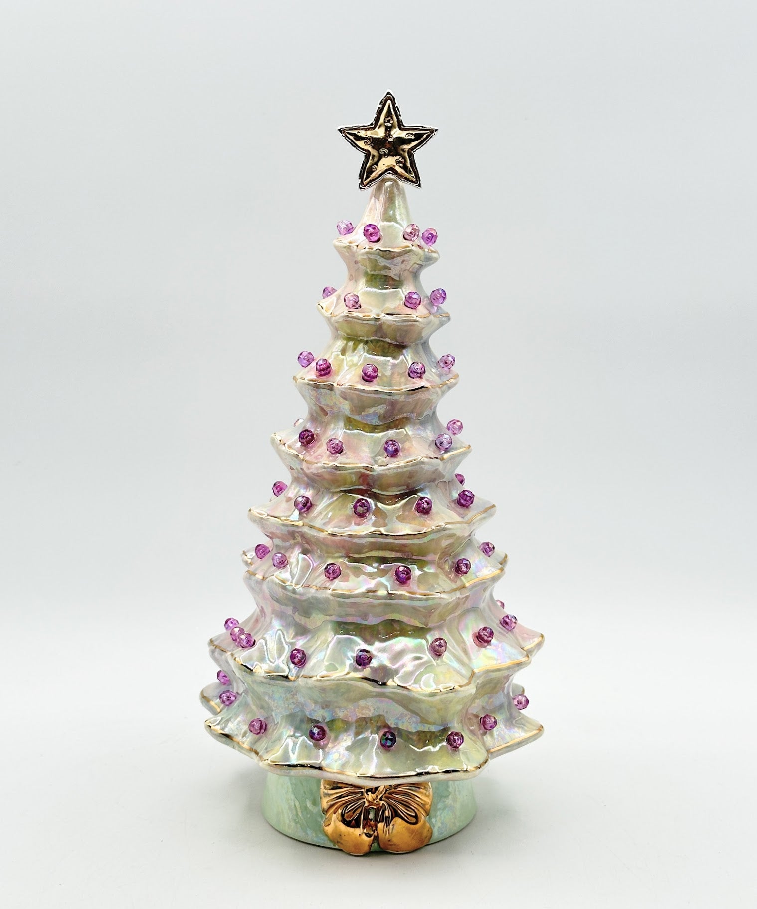 The pastel trees are highly sought after and uniquely finished in a flowing pastel glaze, making them a cherished addition to any home. This 9-inch pastel ceramic tree is versatile enough to enhance your Easter, spring, summer, or holiday displays, offering timeless beauty for every season. The iridescent glaze shimmers in soft pastel hues of pink, green, blue, yellow, and purple, creating a radiant and magical effect. Each branch is delicately touched with real gold for an extra hint of elegance. The pastel green base, adorned with a gold bow, perfectly complements the golden star topper and iridescent purple lights.